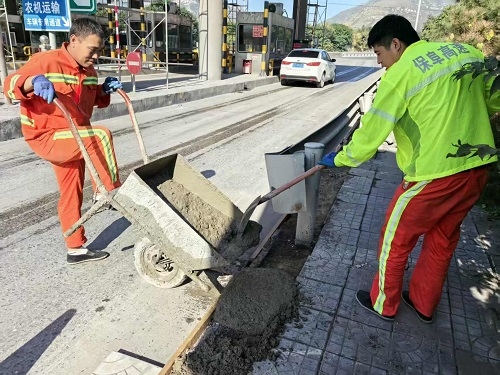 此次维修主要针对收费广场、车道及边侧路面设施进行维护检修,了解到入口车道边侧路面地砖因年久损坏、地砖缺失情况,唐县工区组织施工人员对脱落的地砖重新铺设,并用水泥将地面硬化加固。